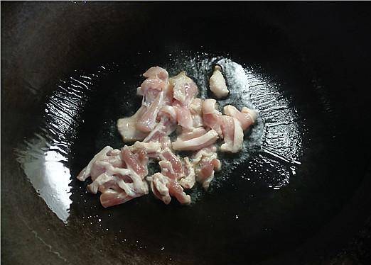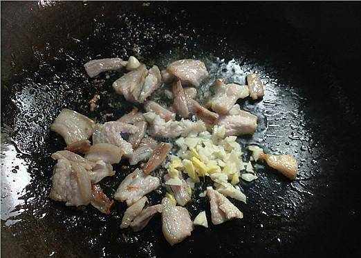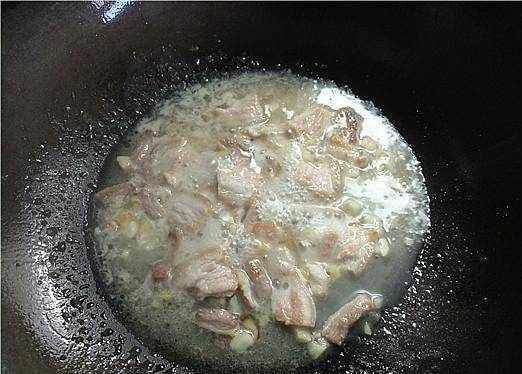 6.因为五花肉带有皮,不容易熟,所以加了小半碗热水,盖上焖煮三五分钟,确保肉煮熟透。如果是比较嫩的纯瘦肉,大火快炒基本就可以熟了,可以不需要加水煮这一步。