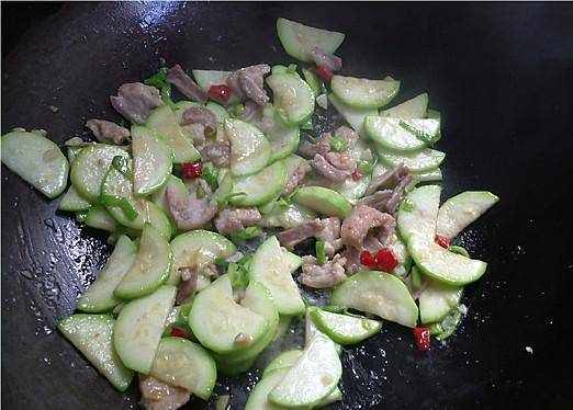 7.水煮得差不多干了,倒入西葫芦翻炒,这里如果感觉糊锅可以加一点油。