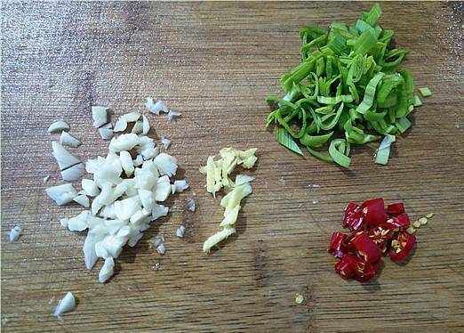 3.姜蒜切好,青蒜叶和小米椒只是为了颜色好看点,可以不要。