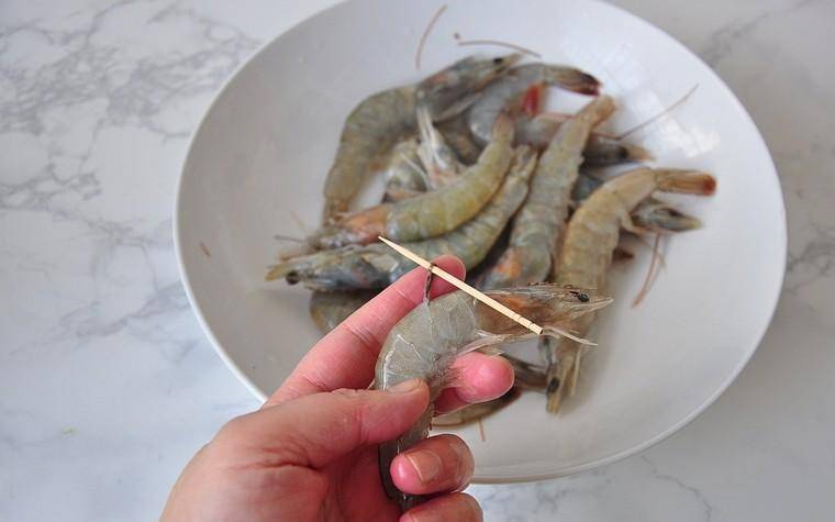 1先给虾去虾线。我用的是海虾,您可以用其他虾,但要记住,一定要掉虾线。我采用的是用牙签在虾背的第二节挑一下,就能挑出黑黑的虾线,这一部分一定要掉,否则吃到口中影响口感。