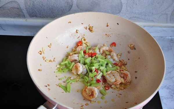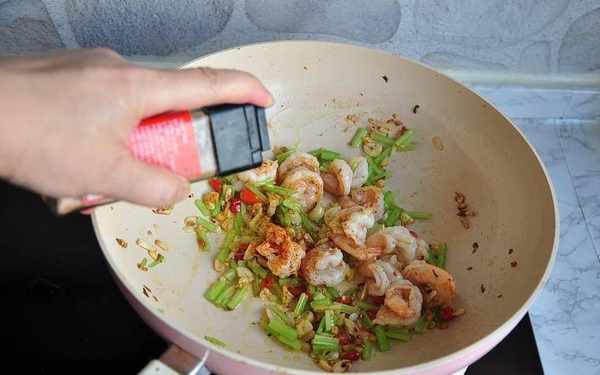 6待虾色变红,虾肉变紧,就加入清洗过后切成小段的香芹,和小米辣快速翻炒。有的朋友喜欢辣一点的口感的话,小米辣可以与蒜末在上一步一同放入。我不能吃辣,主要是为了配色,所以在这一步放。