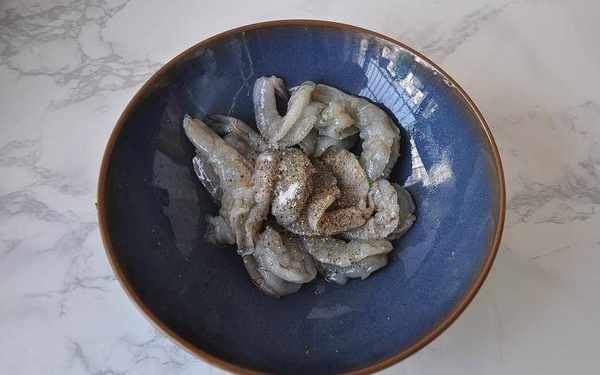 3将开背的虾肉放在碗中,加入料酒和白胡椒,少许盐略腌制,时间允许的话十分钟以上。