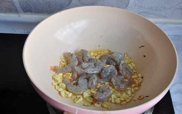 4锅中加入橄榄油,放入切碎的蒜末,开火慢慢炒香。