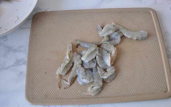 2然后将虾头和虾壳剥掉,给虾开背。虾开背就是用刀贴着虾背划入一刀,不要划透,这样既可以去掉残留的虾线,还可以使虾在烹制时更容易入味。