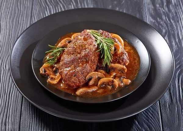 4、将煎好的牛排放在盘子中,倒上蘑菇汁即可食用。