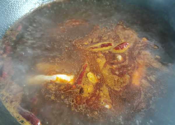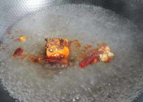 5.水开放入火锅料,喜欢味重点可以再加花椒和生姜,辣椒一起煮