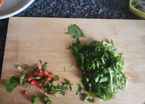 13.撒葱花,芹菜碎,辣椒即可