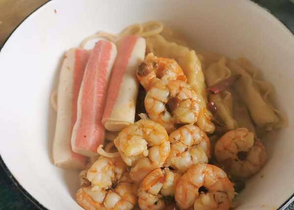 9.放入面条和虾仁煮