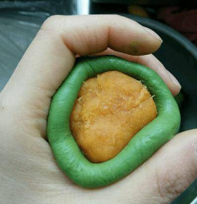 之后加入糯米粉和粘米粉,糖粉,猪油,热水,搅拌均匀,和好之后会有些粘手,所以最好带着手套。然后准备一些馅料,红豆沙馅料是必备的,我又准备了一些最近很流行的咸蛋黄肉松混合馅料。