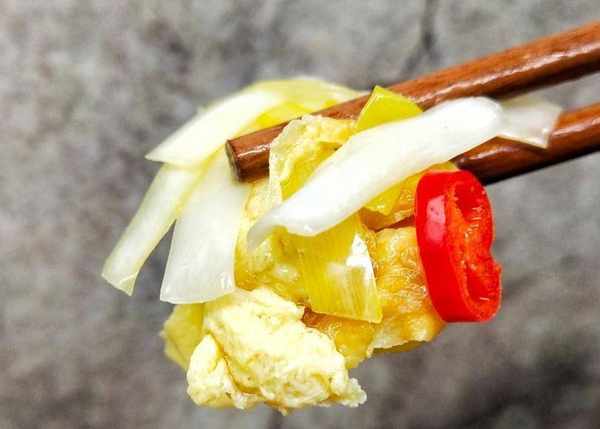 【食材】:韭黄一把,笨鸡蛋三枚,红椒一个