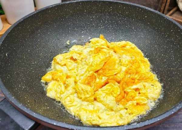 步骤三:把锅烧热,倒入适量的油,烧至六成热,倒入打匀的蛋液,大火煎至一面定型,再将它翻面,煎至两面金黄,用锅铲划成小块,将鸡蛋盛出备用