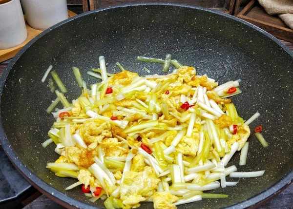 步骤五:在简单的加些盐,生抽,鸡粉调味,最后再加入炒好的鸡蛋,翻炒均匀就可以出锅。鸡蛋和它才绝配,比韭菜鲜美,比西红柿炒蛋好吃,老人孩子都爱吃