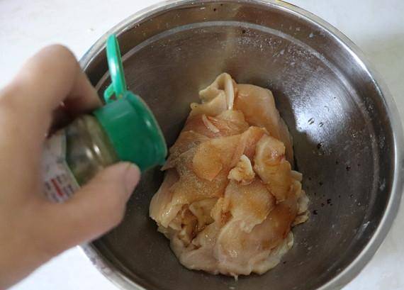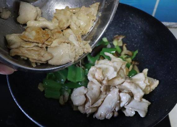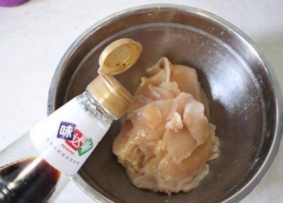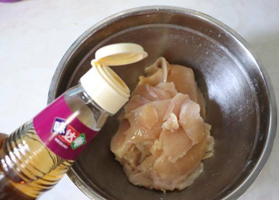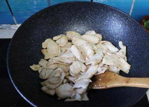 7.锅放油烧热,下入鸡胸肉片翻炒成熟盛出