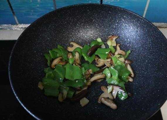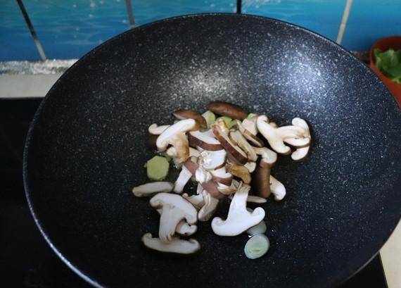 8.锅烧热,下底油,葱姜爆香 ,下入香菇片,翻炒至变软