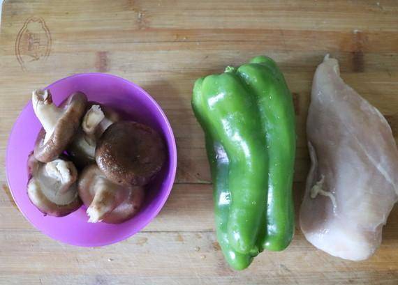 1.准备好所需要的食材,鸡胸肉切大片,青椒切小块,香菇切片