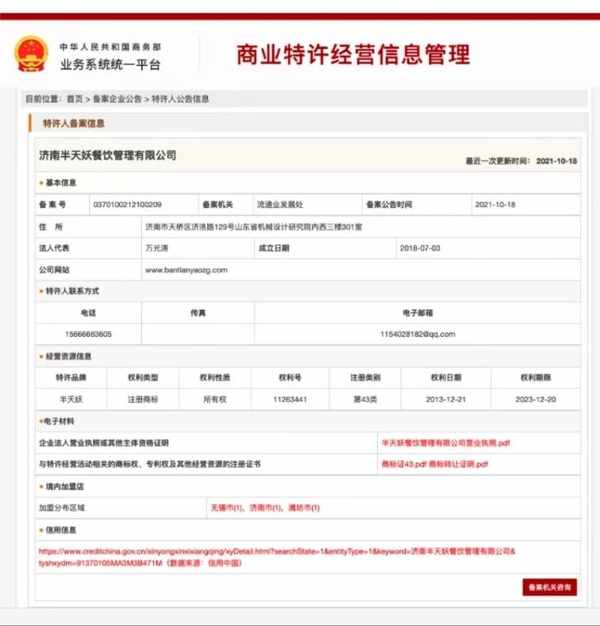 作为通过特许经营备案的餐饮品牌,半天妖烤鱼与传统的直营或者加盟模式不同,其采用的是一种被称为“联营”的经营模式,门店的股权比较分散,其中包括厨师长、店长、前厅经理在内门店管理人员,都会被要求投资入股,而其大约持有门店四分之一的股份,剩余股份分散在拓店团队、公司管理层和供应商手里,普通的员工极少持股。 公开资料显示,“半天妖烤鱼”品牌归属济南半天妖餐饮管理有限公司,但据天眼查app显示,该公司已于2022年10月13日被核准注销。目前,该品牌还关联上海半天妖餐饮管理有限公司、半天妖(上海)实业有限公司等多家企业。 根据官网介绍,半天妖烤鱼总部设立在中国上海,目前已在中国大陆和韩国开设连锁门店1000多家。2020年起,半天妖烤鱼聘请明星张一山以挑选官的身份成为品牌代言人,进入明星代言时代。(来源:中国网财经)