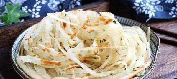 3、用勺子擀出面团,厚约3mm,用勺子撒上擀好的面团,从一端向另一端对折。