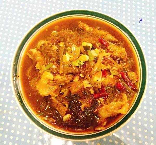 将粉条烧至透明,加入切碎的香菜和葱,关火后加入少许黑胡椒粉。