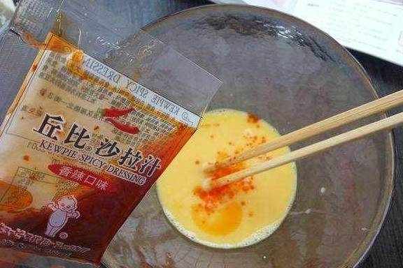 主料:丘比沙拉汁香辣味15g、馒头1个、鸡蛋2个、盐一捏、孜然一勺、辣椒面一勺。