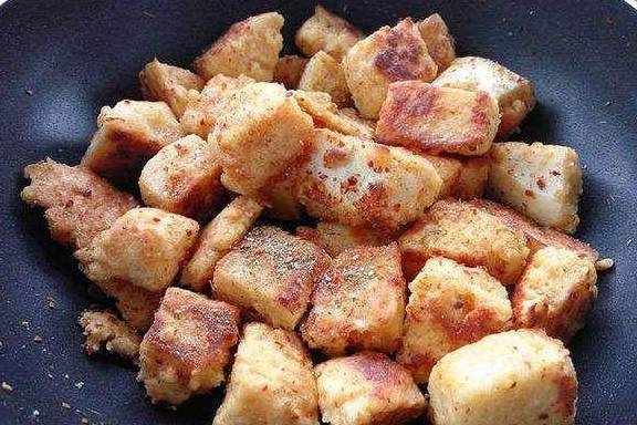 将馒头片煎至完全金黄关火,撒入盐、孜然、辣椒面即可。