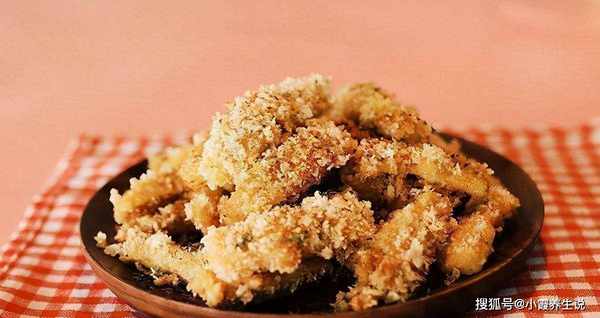 5.平底锅预热后,倒入少量油,将杏鲍菇裹上面包屑,煎至两面金黄捞出。