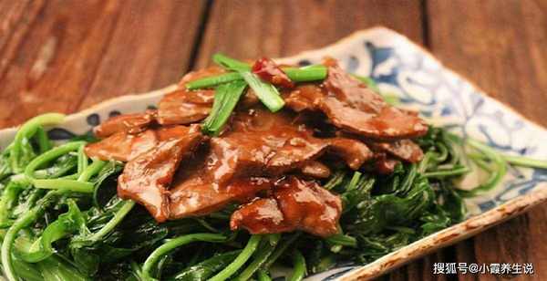 5.在平底锅中加热油。油热后加入葱花和姜丝爆香。加入料酒,加入菠菜段和羊肝煮至熟。加酱油、糖、精盐、味精快炒。从锅中取出并上菜。