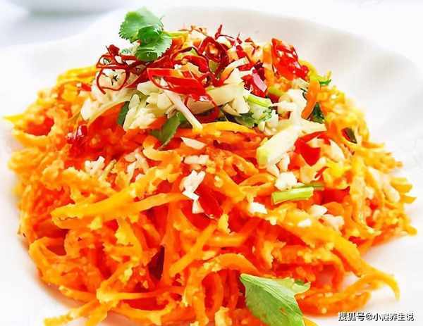 4.姜切末,香菜和干辣椒切段,交替加入香菜、姜和干辣椒在蒸好的胡萝卜条上。