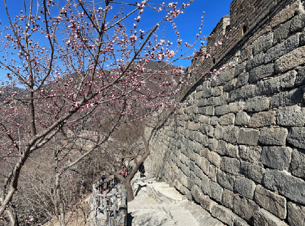待到盛花期,慕田峪长城两侧的山坡上将有大片山桃花、山杏花和少量梨花盛开,在非极端天气下,整体花期可维持半月左右。在前往长城的景区路上,游客还可以欣赏到晚樱、玉兰、连翘、山荆子等。