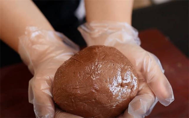 1.准备250g麻薯预拌粉,这个在网上就能买到,再放上10g的可可粉,混合均匀之后放120g的纯牛奶,45g室温软化的黄油, 搅拌成絮状之后下手揉成面团,现在揉匀的感觉就比较像是一摊怎么都整理不好的“烂泥”,最后你会得到一个很完整而且光滑的面团。
