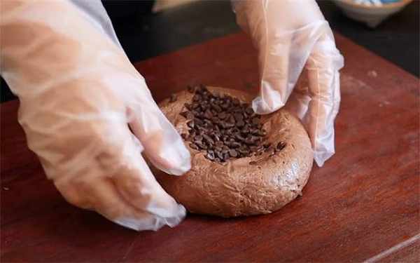2.今天做的麻薯包是巧克力口味的,我准备了30g巧克力豆,直接放进去。