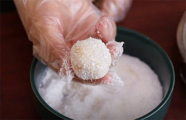 5.接着在椰蓉里面滚一圈,咱们这个山楂糯米糍就做好了。
