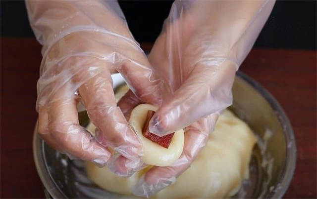 4.直接揪一小块面团出来,在掌心稍微搓一下整理形状,大拇指向下按压,中间放一个自制的山楂糕,然后用虎口处慢慢的收紧收拢。