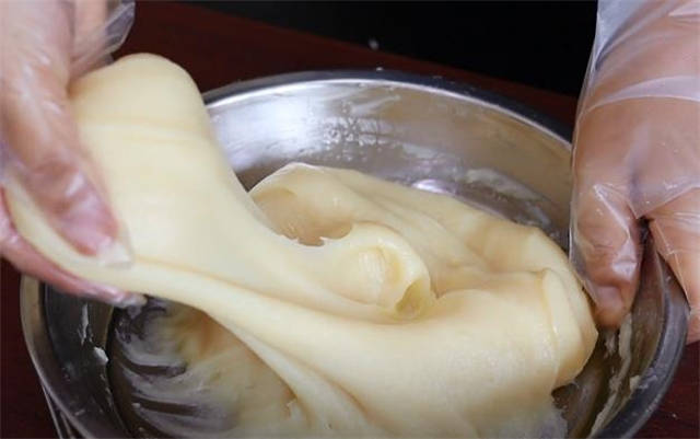 3.时间到了出锅,放60g软化的黄油,等不烫手的时候,把糯米面团和黄油充分的揉在一块,最后揉好的状态就是这种细腻又顺滑的。