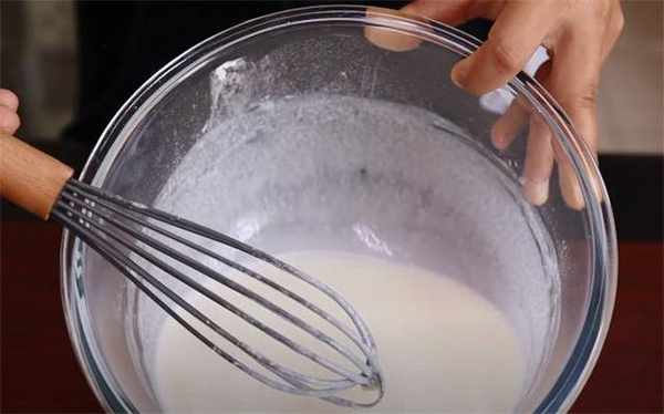 1.准备200g水磨糯米粉,玉米淀粉放30g,白糖60g,300g的纯牛奶,没有的话可以用清水来代替,最后搅好的状态就是这种细腻顺滑的牛奶状。