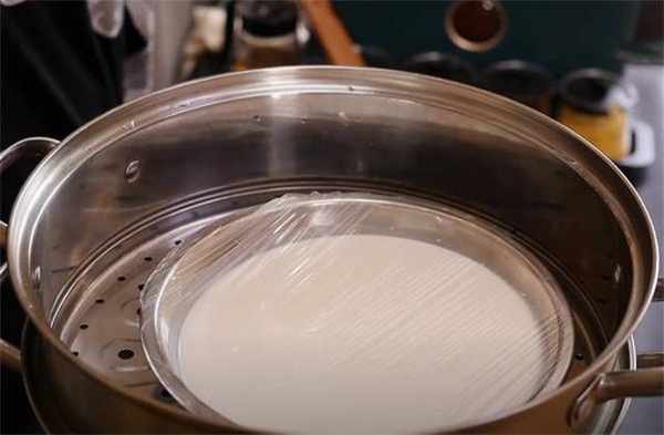 2.这个是做凉皮的锣锣,把粉糊直接倒进去,表面封上一层保鲜膜,扎几个小孔,水开之后上锅,大火蒸20分钟。