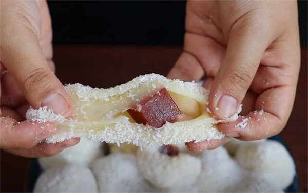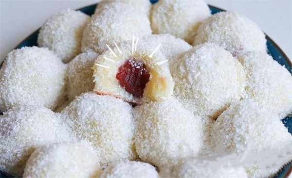 6.做好的糯米糍个个圆溜溜的,吃起来黏糯不腻口,椰蓉糯米和水果的香味聚集到了一块,一口一个刚刚好。