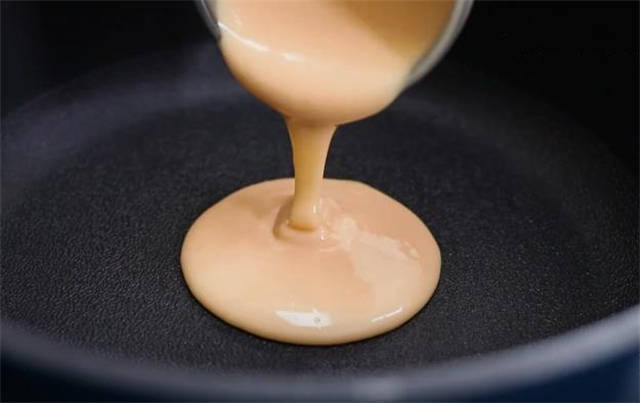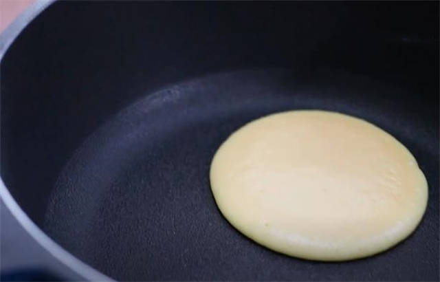 3.我们现在开始烙饼,烙的时候舀一勺面糊,垂直向下不用动,它摊开的自然而然就是一个圆形了。
