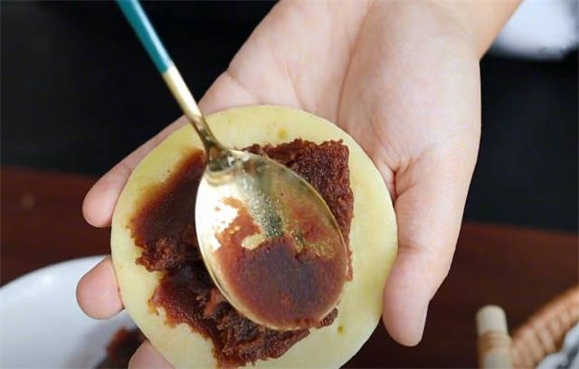 6.这个是自己做的豆沙馅,直接涂抹在饼皮发白的这一面。