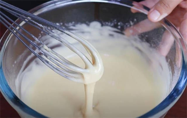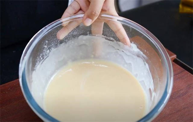 1.碗里先放60g的纯牛奶,30g玉米油,这些液体材料充分的搅匀之后,白糖放40g,奶粉60g,泡打粉4g,低筋面粉放200g,如果没有的话可以用普通面粉来代替,刚开始搅拌的时候先简单的搅匀搅散,然后再用z字形的方式搅拌,这样不容易起筋,最后搅拌好的状态就是这种细腻顺滑稍微粘稠的酸奶状,密封好放到一边静置20分钟。
