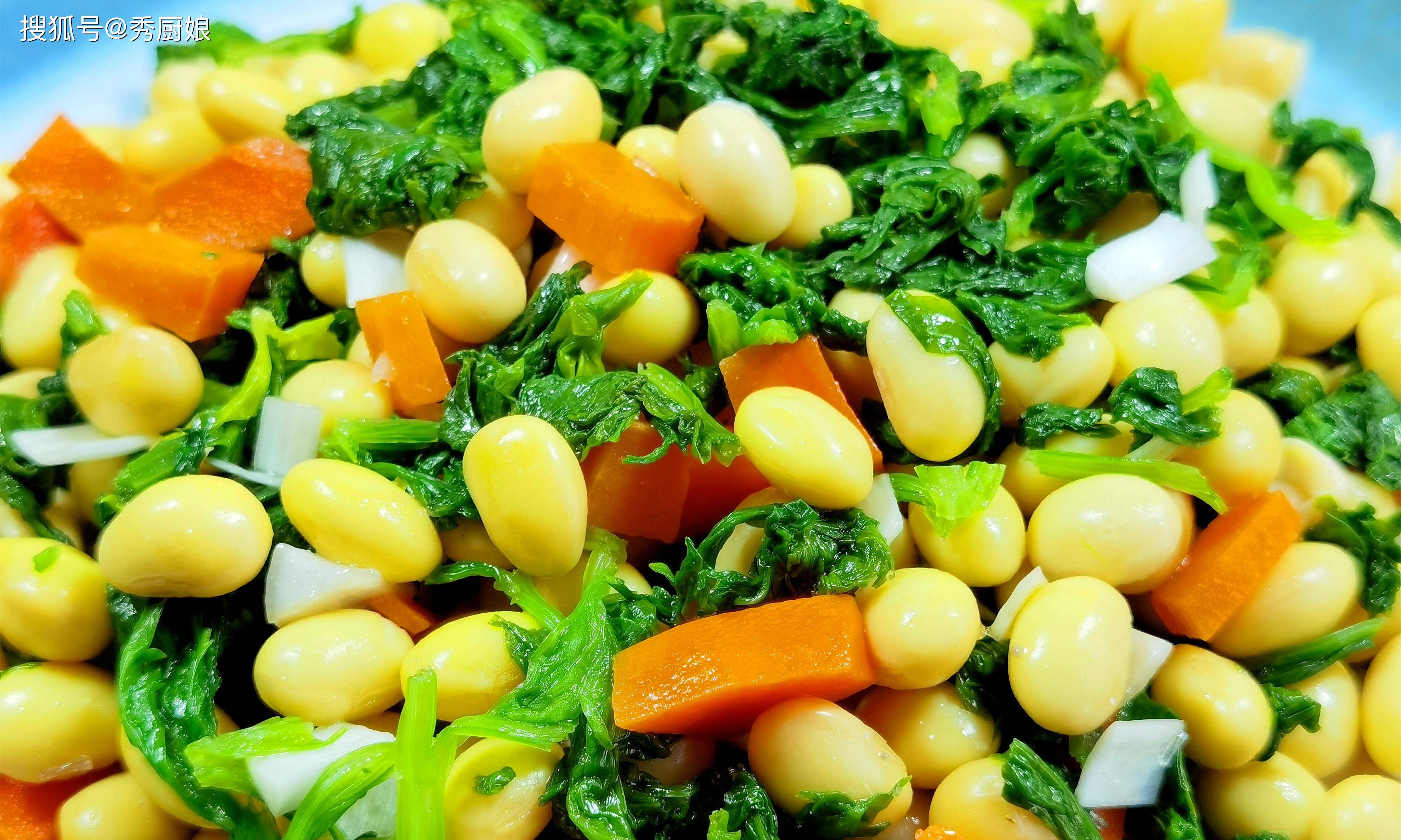 3.将放凉的黄豆捞出,装入盆中,加入芹菜叶、胡萝卜、葱末、盐、蚝油、香油,搅拌均匀后,即可食用。