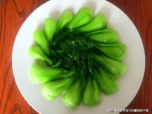 2、起锅烧水,水开加入1匙盐,1匙油(这样煮出来的蔬菜颜色碧绿,营养不流失),放入油菜煮1分钟,捞出油菜过凉水,沥干水分后摆入盘中。