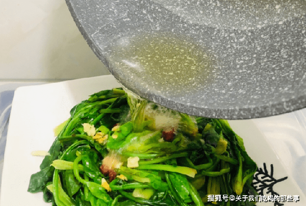 3、把蒜末、干辣椒、白芝麻放在菠菜上,淋入适量生抽,起锅倒入适量油,小火烧至冒烟后泼在上面,激发出香味即可。