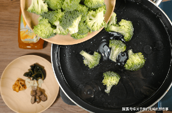 2、蒜瓣切片,香菇洗干净后切小块,西蓝花掰成小朵。烧一锅开水,放入少量食盐、食用油,倒入西蓝花煮3分钟,捞出过凉水,沥干水分。