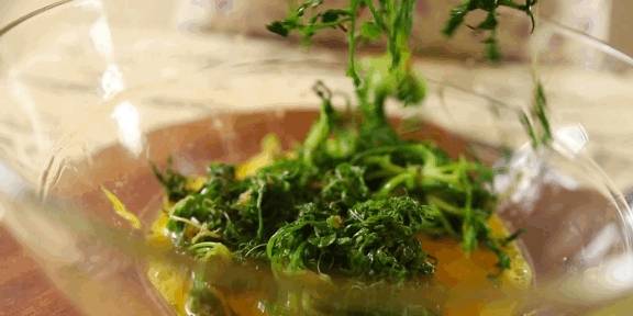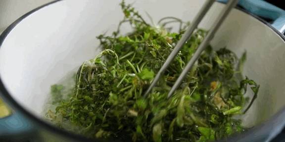 2.水烧开后,把洗干净的荠菜进行焯水,这里有个小诀窍,焯水过后大家一定要用凉水过一遍,这样的话口感更好
