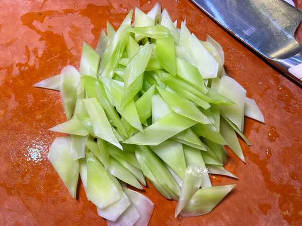 2,莴笋切成菱形片,菱形片很简单,斜着把莴笋切成小段,然后拿起一个小段竖起来,垂直切片就成了。