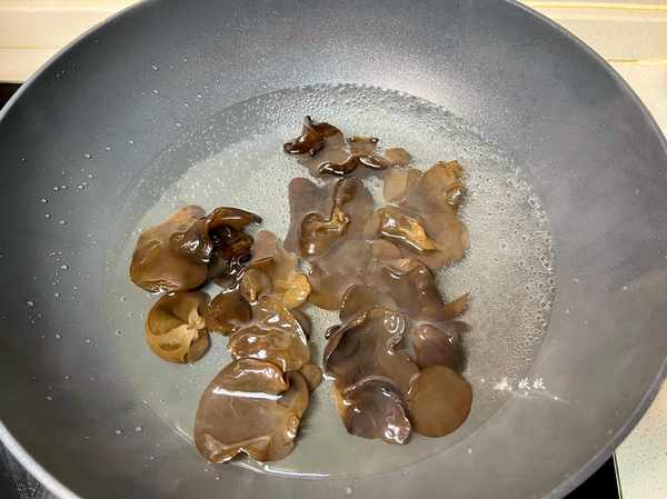 3,锅中烧开水,撒一点点盐,放入木耳焯水,煮熟捞出过下凉水,这样吃起来口感更脆嫩。