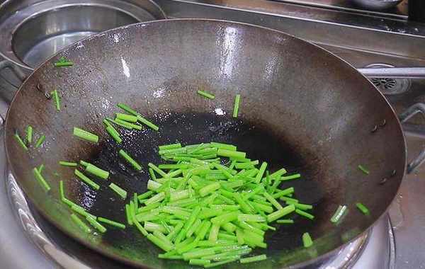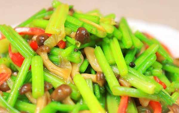 3.锅内烧油,油温五成热时,倒入芹菜段翻炒1分钟左右,芹菜断生、返青以后加入少许食盐,转大火快速翻炒几下倒出来备用。