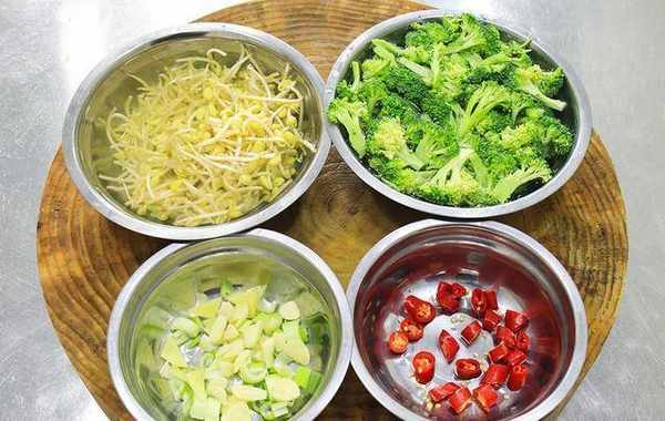 1.准备西兰花一个,切成均匀的小块清水中浸泡,加入食盐2克,食盐可以有效地减少农药的残留;黄豆芽300克,用清水浸泡洗干净;切点小米椒圈、葱花、姜片、大蒜片备用。