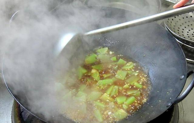 4.锅内烧油,油烧热以后倒入姜、蒜等小料,开小火翻炒出香味,从锅边淋入适量清水,水烧开以后开始调味:加入食盐2克,鸡精2克,老抽2克调色,翻炒均匀后倒入莴笋,加入生抽5克搅拌均匀,盖上锅盖转小火焖2分钟,让莴笋吸收汤汁入味。