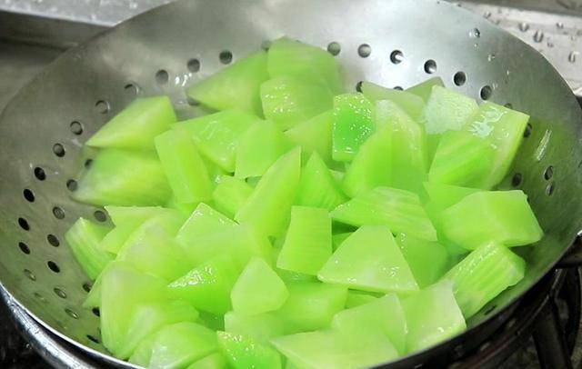 3.锅内烧水,加入少许食盐和鸡精入底味,料酒5克,水烧开以后把莴笋倒入锅中,加入白醋5克,植物油5克,保持莴笋青翠的色泽,防止营养成分流失,焯水2分钟左右,莴笋断生以后捞出,快速用凉水冲洗,控水备用。